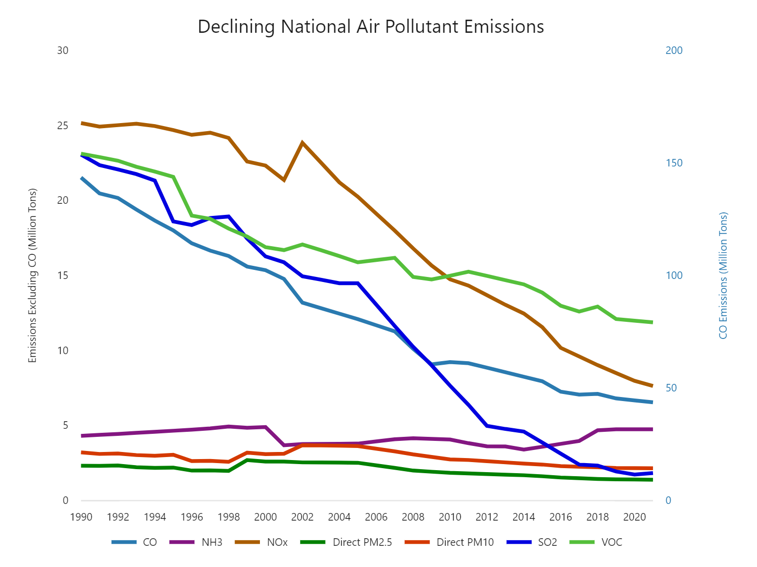 - The emissions reductions have led to dramatic improvements in the quality of the air that we breathe.