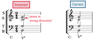 On a grand staff in SATB style, the soprano and alto are written in the treble clef (upper staff), while the tenor and bass are written in the bass clef (lower staff). The soprano and tenor voices receive up-stems, while the alto and bass parts receive down-stems. If the stem direction is crossed, this is an error. Example 1 shows a chord with incorrect stemming, followed by the corrected version.