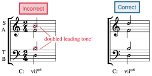 In a triad, the note in the bass is usually doubled in an upper voice. However, there is an exception to this: the leading tone is never doubled. Other tendency tones, such as chordal sevenths, are also never doubled. Seventh chords don’t have any notes doubled because they contain four notes, one for each voice part. Incorrect doubling is seen in the first measure of Example 7, where the leading tone is doubled, followed by a corrected voicing in the second measure.