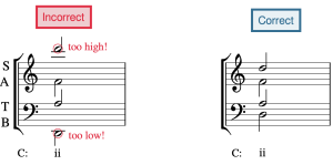 There should be no more than an octave between adjacent upper voices (soprano and alto, alto and tenor) and no more than a twelfth between the tenor and bass. The most common spacing error occurs between the alto and tenor because the notes appear in different clefs. Example 15 first shows a chord with incorrect spacing—the soprano and alto are more than an octave apart, as are the alto and tenor—followed by a corrected version: