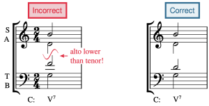 The ranges of voices should not cross. In other words, the soprano must always be higher than the alto, the alto must always be higher than the tenor, and the tenor must always be higher than the bass. In Example 6, the alto and tenor voices are crossed. This error is also the most common between the alto and tenor voices.