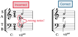 Be sure to check each chord for correct notes and accidentals, and make sure that your chords are not missing any notes. In Example 2, the first chord has accidentals erroneously added to two of the pitches, which are removed in the second chord to create a correct B diminished triad in first inversion.