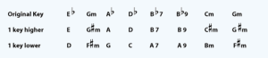 Now say you have a song in the key of E flat. It’s not hard to sing in that key, so you don’t want to go far, but you really don’t like playing in E flat. You can move the song up one key to E, but you might like the chords even better if you move them down one key to D. Notice that if you are a guitar player, and everyone else really wants to stay in E flat, you can write the chords out in D and play them with a capo on the first fret; to everyone else it will sound as if you’re playing in E flat.