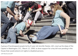 Although IDEA offered more improvements in the rights of people with disabilities, it did not address all their needs. The Americans with Disabilities Act (ADA) picked up where IDEA left off. In 1990, a group of disability rights activists went to the United States Capitol building in Washington, D.C. Their goal was to achieve rights for disabled Americans. The activists got out of their wheelchairs and crawled up the 78 stone steps of the capitol building, which was inaccessible to wheelchairs. It was referred to as the Capitol Crawl and was a significant event which spurred the passage of the Americans with Disabilities Act (ADA). The Capitol Crawl showed the willingness of people with disabilities to unite for a common cause.